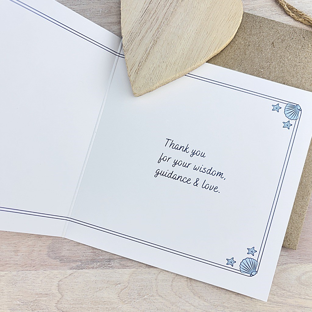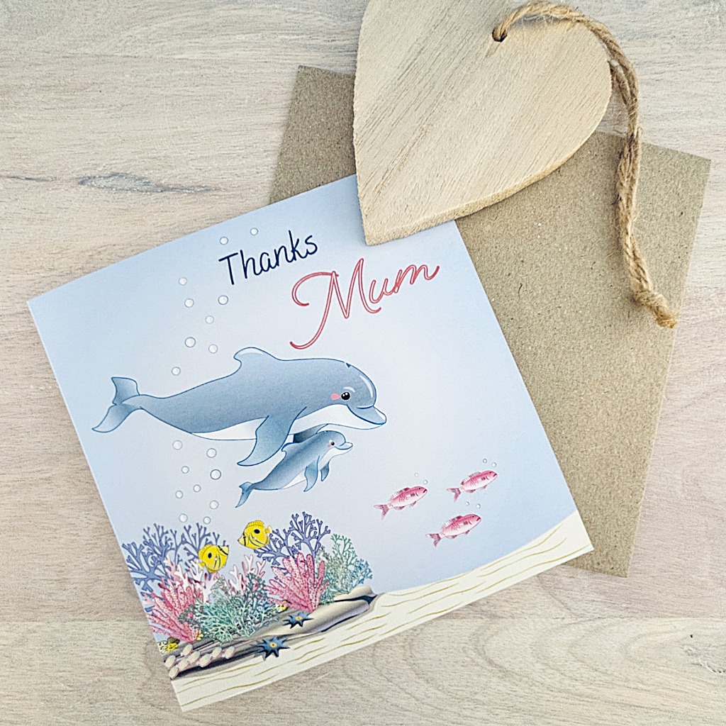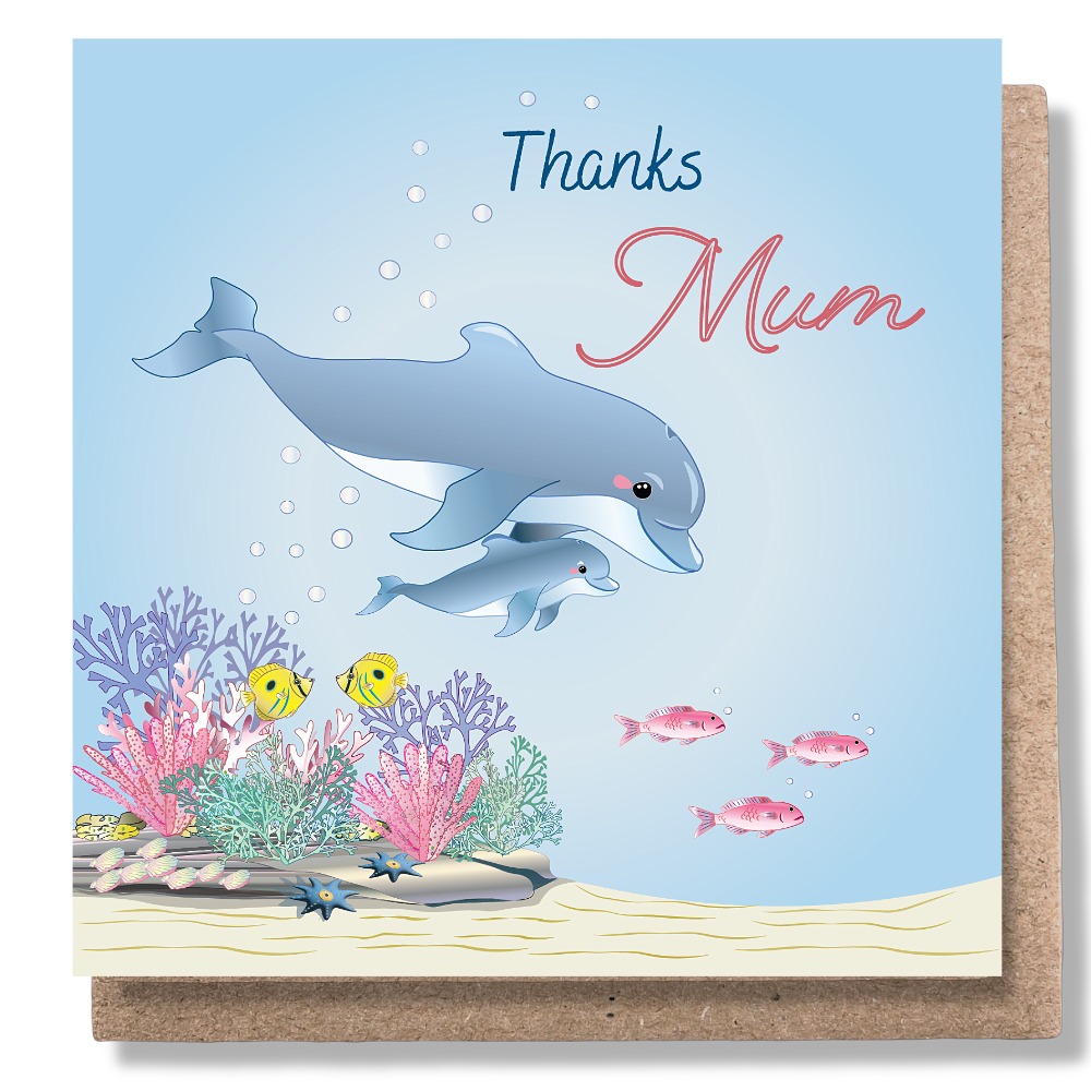 Thanks Mum features a maternal dolphin teaching and guiding her youngster. The card is printed sustainably on 100% post-consumer recycled paper.
