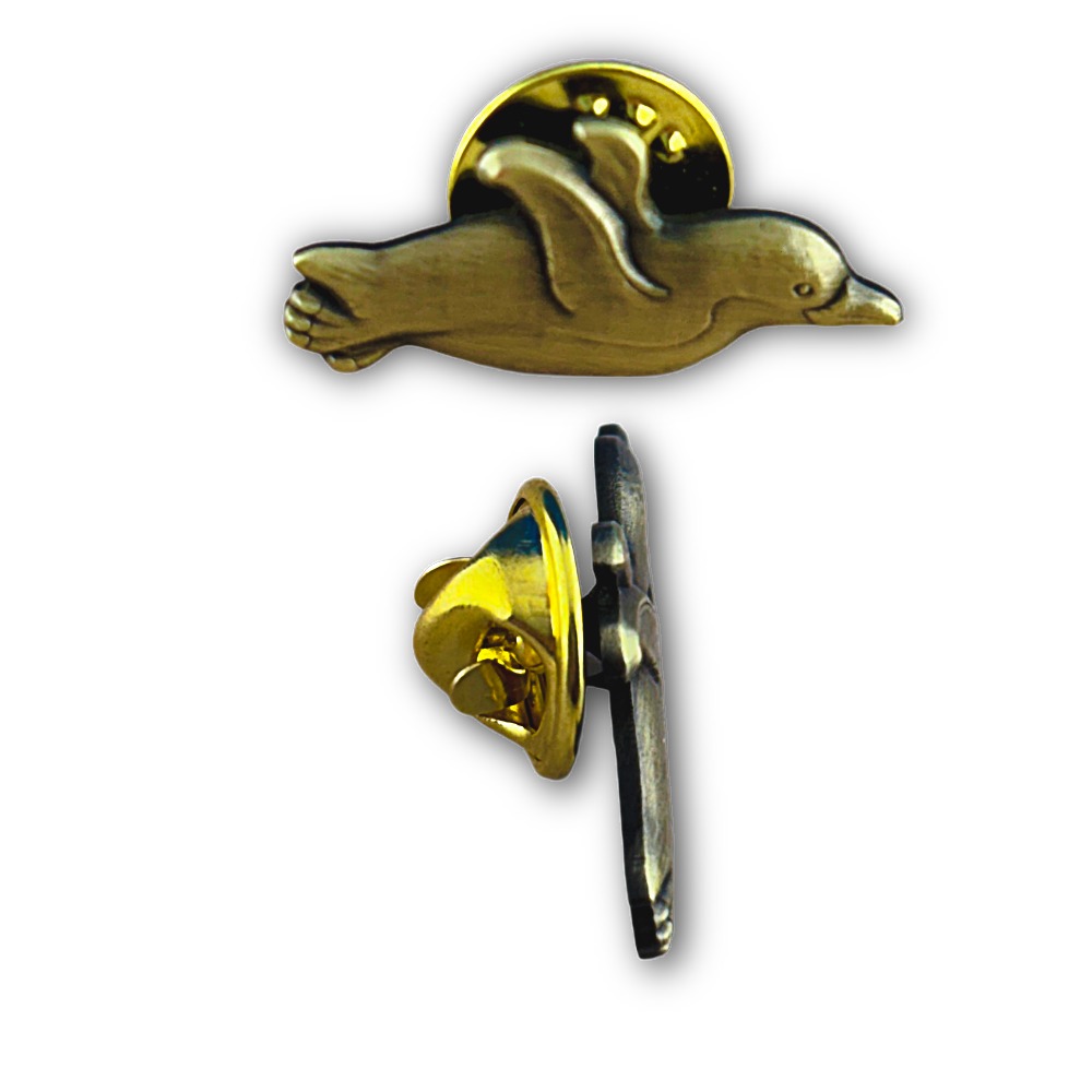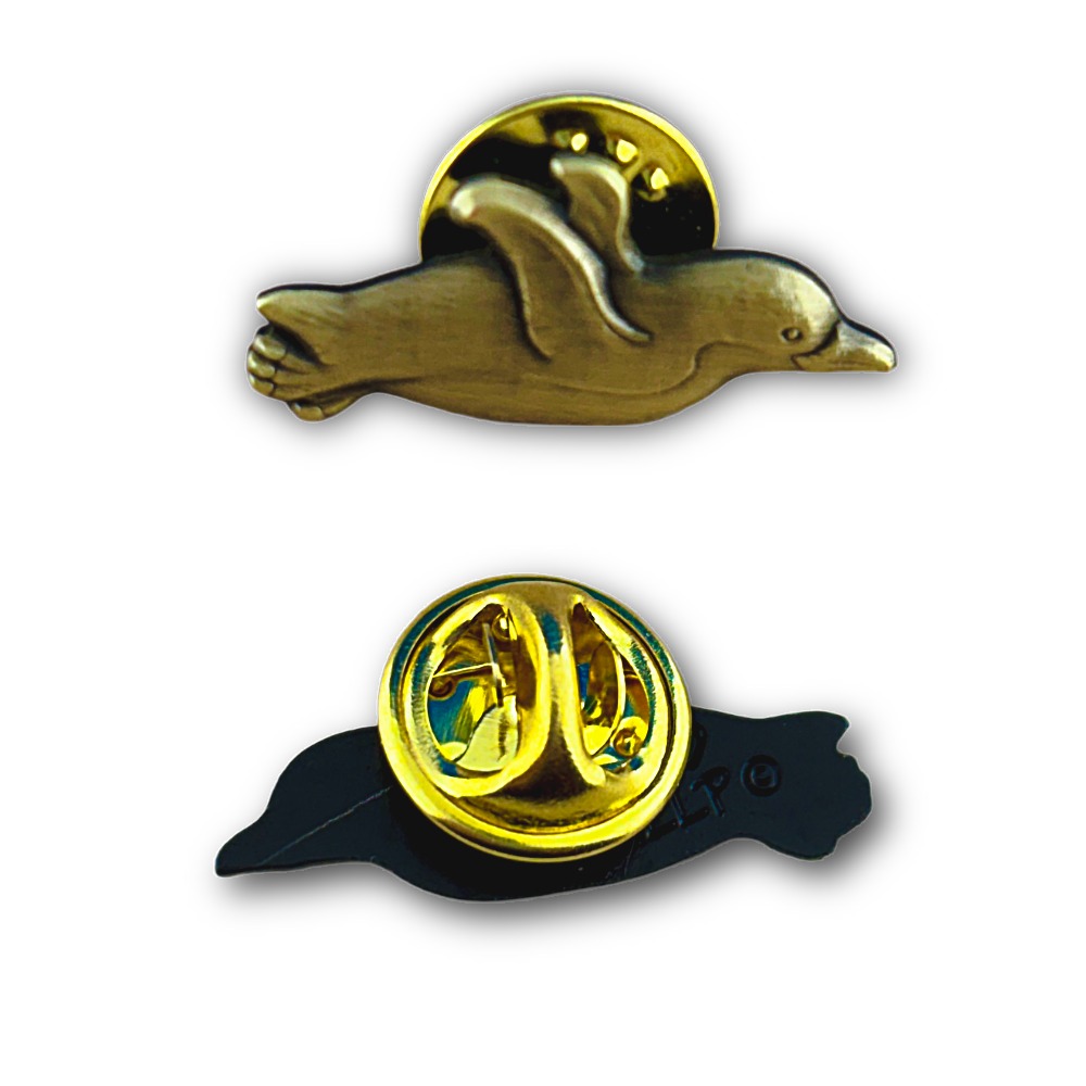 Check out our swimming penguin lapel pin in bright gold-plating.