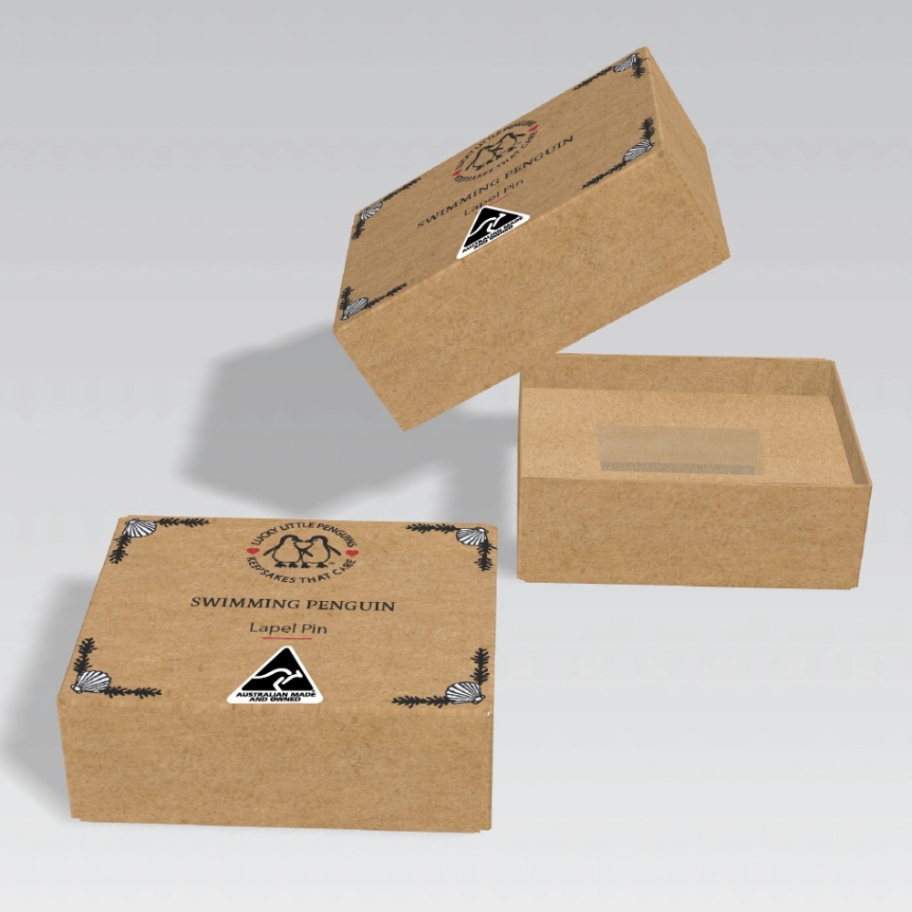 Our new adorable swimming penguin lapel pin is proudly registered with the Australian Made Campaign. The penguin pin is displayed in a two-piece eco-friendly Kraft gift box which is also Australia made. A petite pin design that would look great on any garment collar.